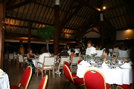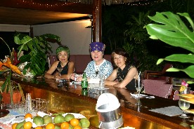 トパーズダイニングにいる人気ウエイトレスやウエイターが早速踊っていた。その中に入って家内も。(写真左右)