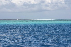 お昼近くになると浅くなっている沖合の珊瑚礁はコバルトブルーになっていた。(写真右)