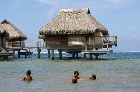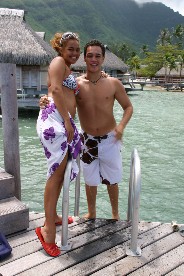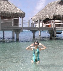 海上コテージの前で泳いでいたタヒチの若い男女。写真を撮らせて欲しいというと喜んで応じてくれた。(写真左)