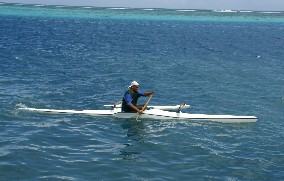 海上コテージの近くまでアウトリガーのあるカヌーが近づいてきた。(写真右)