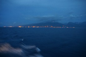 船はとっくに港を離れていた。大急ぎで船上デッキへ上がってみると既に日は落ち左舷にタヒチ