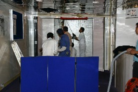 側面のハッチを開けて下船準備中(写真左)、遠くにオークランドのシンボルタワーが見え始めた(写真右)