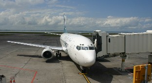 出発ロビー(写真左)とこれから乗る予定の航空機(写真右)