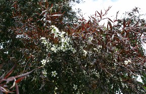 真っ赤な色をした葉が美しい。そう言えば白い花が咲いていた(写真左)