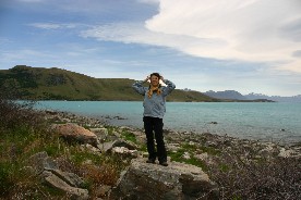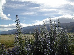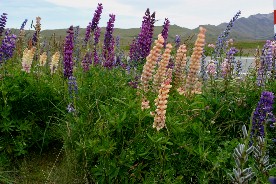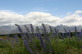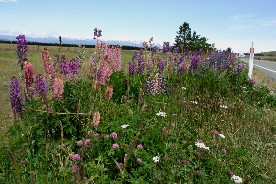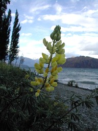緯度が高い南島の夕暮れは遅い。ルピナスを初めとする色んな花が夕暮れの湖畔に咲いていた(写真上)