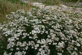 空には雄大な筋状の雲が広がっていた(写真左)何という名前の花だろう。白い花が群咲いていた(写真右)