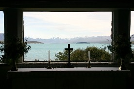 教会の中に入ると窓枠を通してデカポ湖がまるで額縁の中の絵のように見えた(写真左)