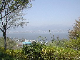 さすがはスキーのメッカです。なだらかな山の斜面にはたくさんの雪が残っていました。 眼下には霞がかった白樺湖が見えます。 ![]()