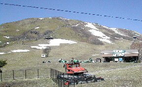 こんな三人がけの幅広いリフトで頂上を目指します。山頂付近には雪が残っていました。 ![]()