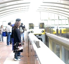 ディズニーリゾートラインというモノレールカーがディズニーシーやディズニーランドを結んで循環している。 左はホームへモノレールカーが入ってきたところ。そして、モノレールカーの車内の吊革はミッキーマウスだった。 ![]()