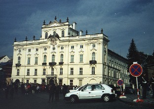 プラハ城と広場を挟んで向かいにある建物 壮大なプラハ城と聖ヴィート教会の建物群、今日も、お城は政務等に使用されているようです。