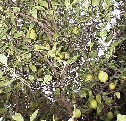 12月上旬、ユズはたわわに実を付け、黄色く熟れて枝重く垂れ下がっている。レモンも一昨年