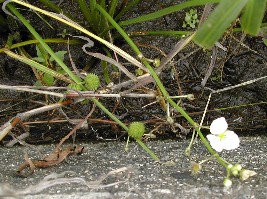 田んぼの中には、このような可憐な花が咲いている(左がウリカワ、右がヒレタゴボウ) 長い長いたんぼ道を抜け、やがて足守川のほとりに出ます。そして、この川の橋を渡ると吉備津神社までは、