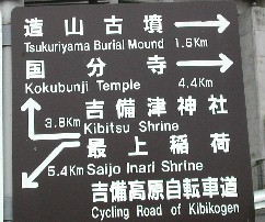 この案内板から吉備津神社方面に向かう ここで吉備の歴史跡をたどる道とはお別れです。先程まではサイクリングやジョギングの人達とも行き交うことが