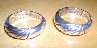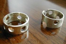 完成作品、右の写真の左側が家内の作品 ・テーパー状になった木の棒の指のサイズのところにパラフィン紙を巻き付けておく。(今までのリングの時と同じ)