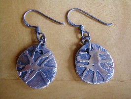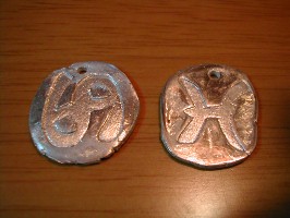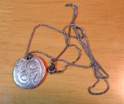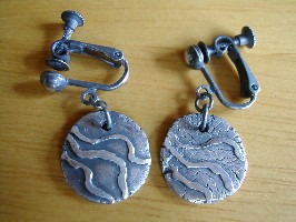 左は仕上げ前の作品(左は私が作ったもので、右は家内が作ったもの) 後日、ムトーハップによる「いぶし銀仕上げ」にしてチェーンを付けたもの ・銀粘土を丸めて平たく伸ばす。