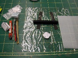 左の写真は道具一式、ラップ、パラフィン紙、ローラーと厚板 右の写真はカッターナイフ、ピンセット、磨き棒、金ブラシ、細絵筆 その他、指輪製作の際使ったテーパー棒(下) 先生が作られた参考作品 2004年10月18日追記