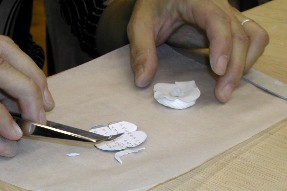 ・薄く伸ばした銀粘土板の上に花びらの形をした型紙を置きます。