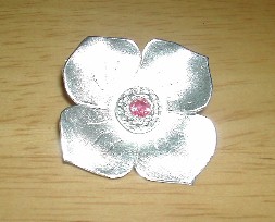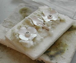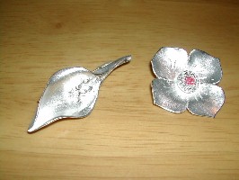 右は出来上がった作品 左の写真は家内が作った水芭蕉と私が作った花 銀粘土細工の講座は今回で終わりました。今回は花を形取ったブローチを作りました。その工程を簡単に