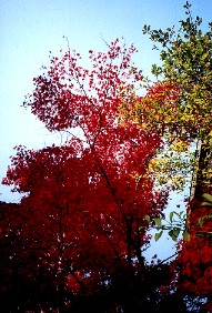 龍ノ口神社の境内の紅葉、紅葉をバックに記念写真 2001年11月26日撮影 この日は、お天気が良かったせいか、たくさんの人が山歩きを楽しんでいる。お年寄りの夫婦、