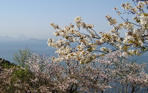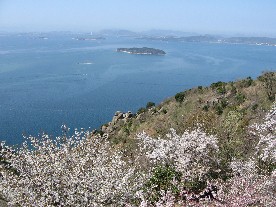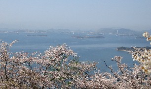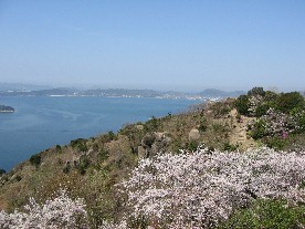 には素晴らしい瀬戸内海の眺望があった。桜と瀬戸内海の景色を入れた写真をカメラに納め