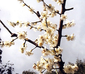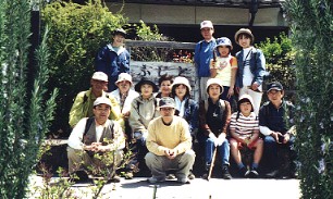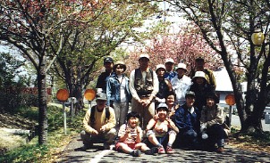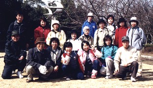 今が見頃といったところの白梅 緩衝緑地帯の中の公園で参加者全員 2001年3月4日撮影 ここのところ、ずっと風の吹いている日が多かったのですが、この日はことのほか風が強く