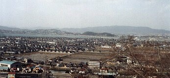 亀島山山頂付近から遠く水島コンビナートを眺める 2001年3月4日撮影 私達が山頂に着いたのは昼少し前でした。周辺の景色を楽しみながら記念写真を撮った後、