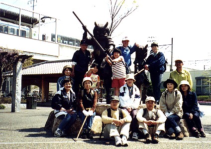 茶屋町駅前の鬼装束の親子の銅像の前で 2001年4月15日撮影 茶屋町駅を後にして、朝来た道を一気に引き返えしました。帰りは一ヶ所休憩しただけで、