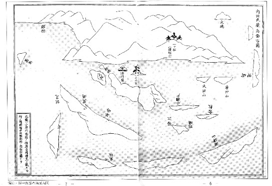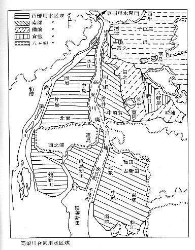 これは倉敷周辺部の古い地図です。現在の市街地のほとんどが海の中となっています。 左の方に高梁川が流れています。斜線の部分が干拓されたところです。 写真は岡山県の干拓という本からお借りしました。 水島にコンビナートが建設される遙か以前から、新田開発のために、島と島の間の多くの海岸が