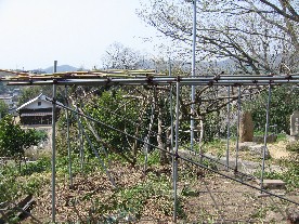 また、上の写真のように鉄パイプを使ってキウイの棚の修理を行いのり面での作業がし易いように足場を作った。