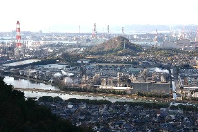 日本合成水島事業所、背後にある山の周辺が松江という集落