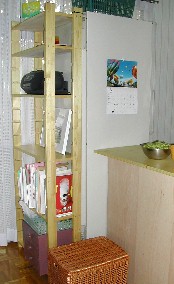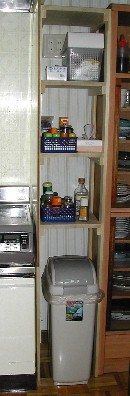 パソコン台、冷蔵庫と背中合わせの本立て、家内のスペース全景 シンクの上を塞ぐような形で乗っかっていた食器洗い乾燥機は、冷蔵庫を移動したので、その分、左に寄せることが