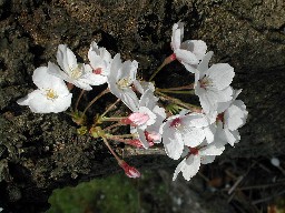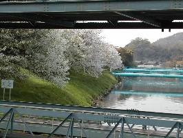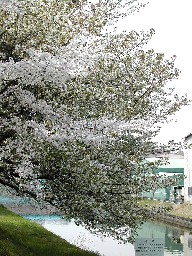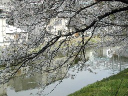 太い枝からも可憐な花が開いていた。よどんだ流れだが遠目には桜を映す鏡にも見える。 ![]()