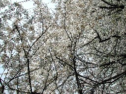 道の左側には桜の木が植えられています。見事な大木です。ソメイヨシノや実をたくさん付ける白い花の