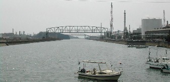今は堤防の先も埋め立てられ工場敷地になっています。堤防の上に植えられたキョウチクトウ越しに