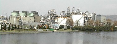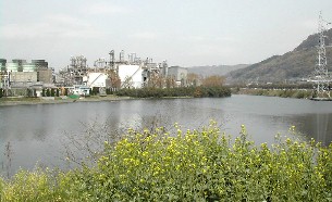 遊水池を挟んで向かい側には日本合成の工場があります。こうして遊水池の端から見ますと南北に
