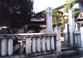 荒神さんの庭と石垣、小さな空間だが子供の頃には紙芝居なども来ていた。 近くを流れる高屋川の支流には、鬼やんまや、蚊取りやんまや、お歯黒トンボがたくさんいた。高屋川のほとりには