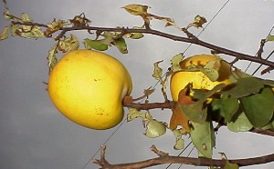 左は初めての黄色く色付いたカリン 2000年秋撮影 右は本格的に成りはじめたカリン、花が終わり小さな実に