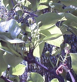 花が終わると、やがて花の一つ一つは実になります。ナシと同じように一カ所に固まっている実を