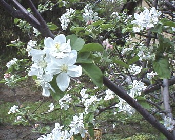 リンゴの木も、ナシの木にやや遅れて花を開き始めます。リンゴの花はつぼみの時には少しだけ