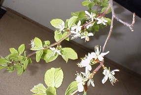 右は2000年4月中旬、開花期を迎えています。白く小さな花です。 左は5月下旬頃の実が大きくなり始めたところです。