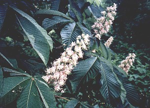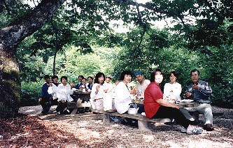 トチの花とトチノキの下の朝食 1999年6月 朝食後は園内の散歩。とてもすべてをまわりきる事が出来ないくらい園内は広く、もみじ滝まで行ってUターン。