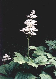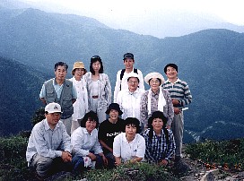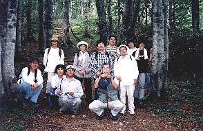 ブナ林にて、右の花は矢車草 1999年6月 夕食は持っていった材料でサラダ、カレーを作り、楽しく食事をしました。山登りの後の食事は、また、格別です。