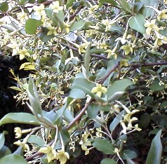 左はびっくりグミの花 2001年4月中旬撮影 右はたわわに実った実、色はオレンジから赤へと変化していく