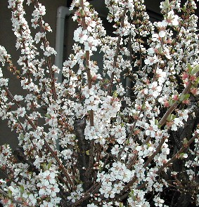 満開の白く小さくて可憐なユスラウメの花 2002年3月下旬撮影 真っ赤に熟れたユスラウメの実 2000年6月撮影