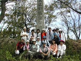 昼食後、山頂の上野隆徳公の石碑の前で記念写真 右は隆徳公が切腹した場所で腹切岩と言われている ![]()