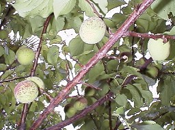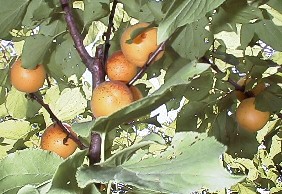 色づき前のあんずの実 2000年5月下旬撮影、右は収穫直前のあんず 2000年6月14日撮影