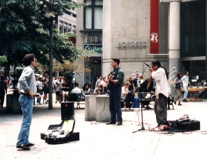 市内至る所で目にする風景、街角の音楽師達 この日はボストン美術館の無料開放の日だった。入り口でバッジを貰って中に入る。バッチが