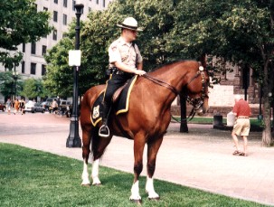 左は超近代的なビル、そのガラス窓に古い教会が映っている、右は市内をパトロール中の騎馬警官 食事の後は、昨日、申し込んでおいたダックスツアーに参加するため乗り場まで歩いて行く。