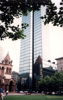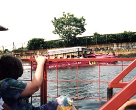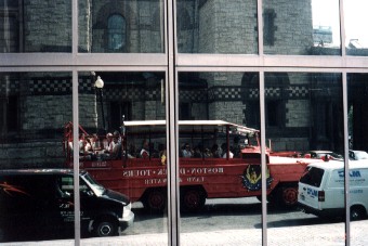 ダックスツアーの車中より(左は水上、右はビルの窓に映った私達の車) 暑さと観光案内の英語が全く理解できないのとの両方で、車の上でついうとうととしてしまい、娘に